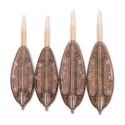 These feeders are easy to load and compress without a mould as the thumb fits nicely into the body. The feeder has curved walls and inner teeth for secure hold of pellet or groundbait. The open ends of the body allow for flush-through evacuation of bait right in the feeding zone.
