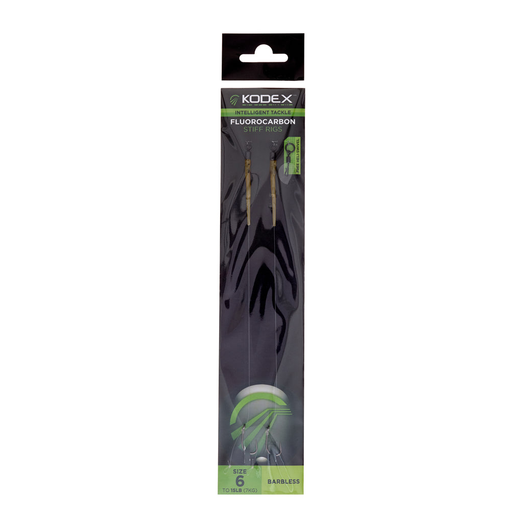 These fluoro stiff rigs feature 130-grade carbon GenomicMGP matt anti-glare hooks, with micro-ground super sharp points for secure piercing, tied to 15lb fluorocarbon line with a special knotless knot to stand-off the hair in the optimum position. This combination offers excellent rig concealment from wary carp. The rigs feature anti-glare quick-change size 8 carp swivels and you can easily interchange one with the size 11 Flexi/Heli swivel (included in the packet). The clear-coloured anti-tangle sleeve pushes the rig forward on the cast. Each packet contains 2 rigs; see for yourself how Kodex rigs can help increase your PB.