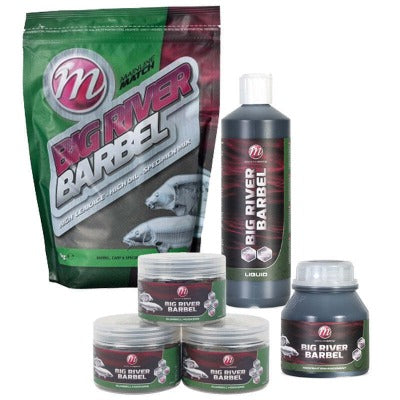 Big River Barbel Mix Groundbait - Mainline's Big River Barbel Mix is the perfect recipe for big Barbel and all specimen species. The Groundbait consists of ground high oil pellets, quality fishmeal's, and active ingredients including crushed hemp and garlic, to form the perfect food source. This offers a high leakage, controlled breakdown to disperse an attractive, far-reaching food signal throughout flowing water and large venues. The easy mix Groundbait can be used both in the feeder or as loose feed on both Rivers and lakes and is supplied in a 1kg resealable bag. Big River Barbel Liquid - This thick, oily liquid is a condensed, feed inducing attractant containing the same flavour ingredients used within the Big River Barbel Mix. Specifically formulated to draw fish into the baited area with a far-reaching dispersal of attraction, targeting the sensory organs of the fish - perfect for large venues and flowing water. This ensures that fish are attracted from all levels in the water column, as well as from distance. Perfect for coating boilies, pellets or mixing with groundbaits. Meaning you can combine this liquid with any presentation at any time of year. This liquid is PVA Friendly and comes in 500ml bottles. Big River Barbel Dumbell Hookers - Using the same top-quality ingredients as the Big River Barbel Mix, these uniquely shaped Dumbell Hookers provide a durable and attractive, high oil content hookbait to match your mix perfectly. Available in 150ml tubs in three sizes 10mm x 12mm, 12mm x 15mm and 15mm x 18mm. Big River Barbel Hookbait Enhancement - Containing the same active blend of flavours used in our Big River Barbel Mix this Hookbait Enhancement is designed to maximise the attraction around your hookbait - simply dip/soak the bait before casting or use as a glug. Supplied in a 75ml bottle. |