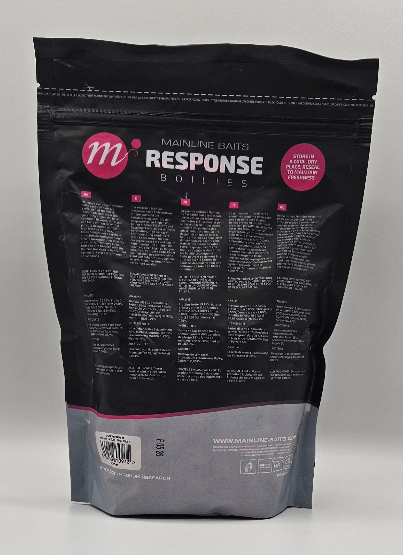 Mainline Response Boilies, Specially for anglers who do not have time to roll their own boilies, or for one-off visits to venues where there is no possibility of establishing a food source, the Mainline Total Response bait are proven winners. Using the finest quality human food grade ingredients Mainline have formulated a new generation of readymade baits which begin to work as soon as they enter the water. A high leakage base allows the flavours and attractors to leak quickly from the bait due to its porosity and texture.
