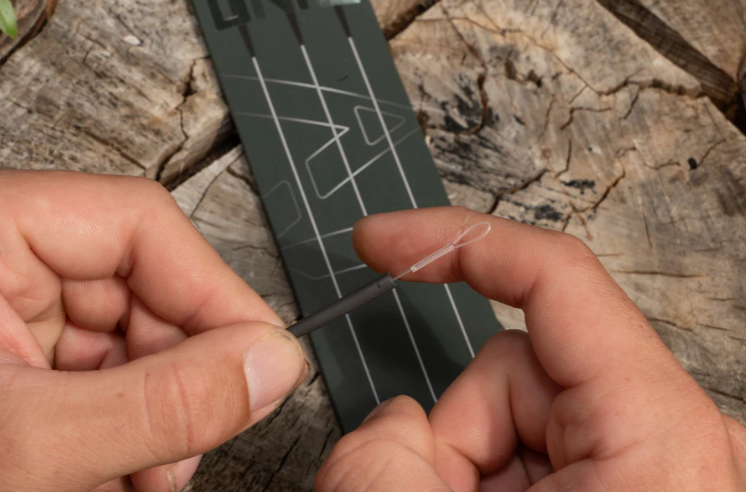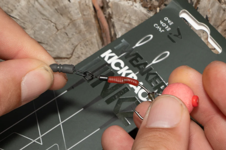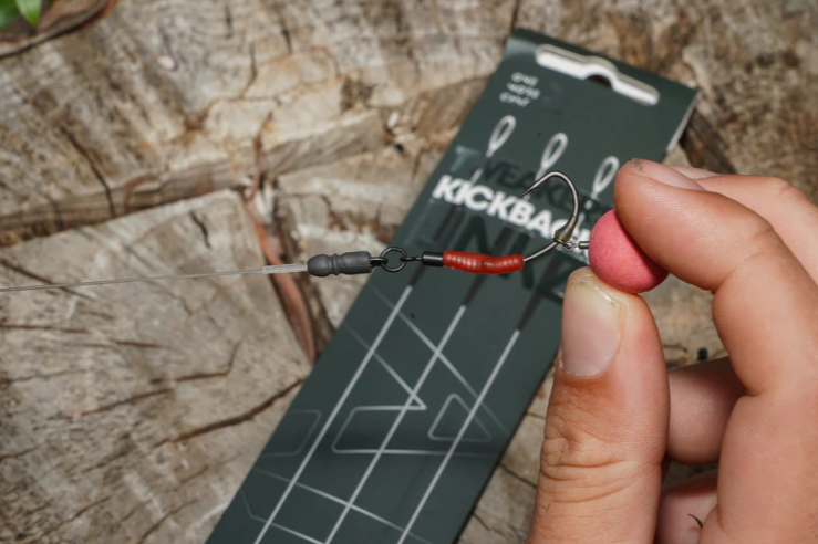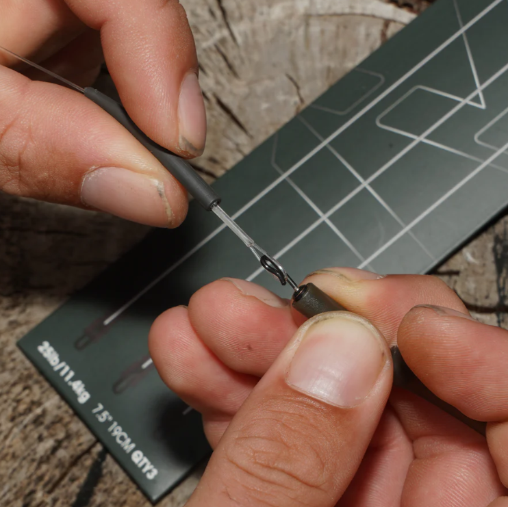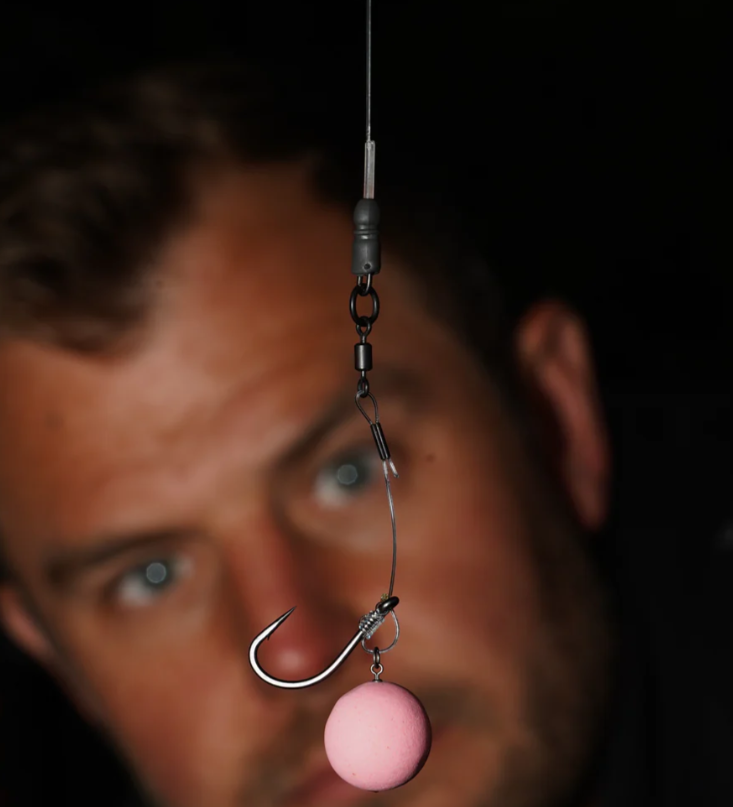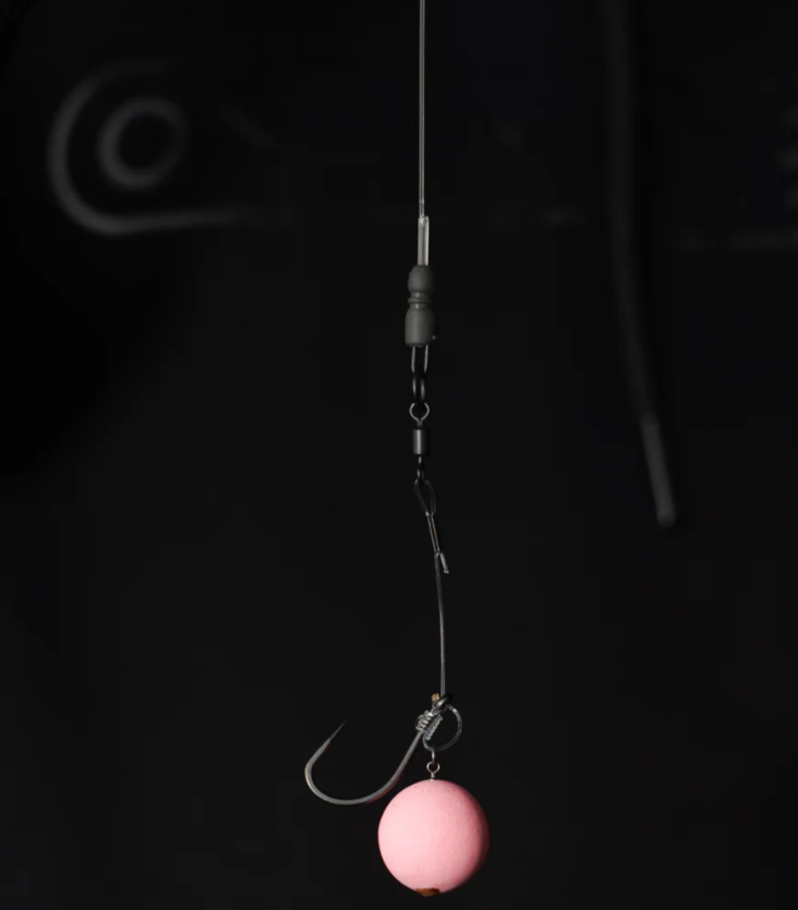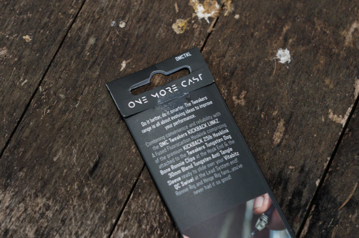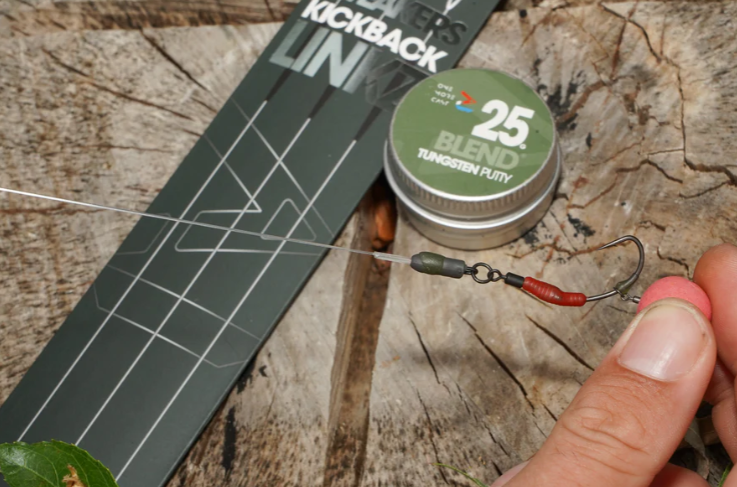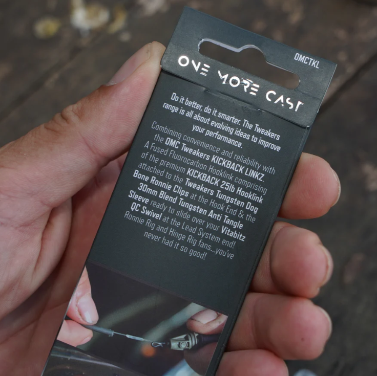 A Fused Fluorocarbon Hooklink comprising of the premium KICKBACK 25lb Hooklink attached to the Tweakers Tungsten Dog Bone Ronnie Clips at the Hook End & the 30mm Blend Tungsten Anti Tangle Sleeve ready to slide over your Vitabitz QC Swivel at the Lead System end.