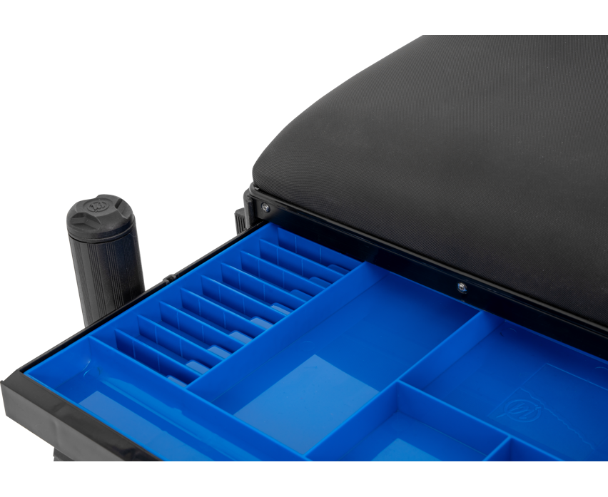 Despite the compact design, this seatbox is incredibly stable thanks to the 36mm telescopic legs and secure clamping knuckles, and comes supplied with a deep 75mm base unit, deep side unit and deluxe padded seat with shallow draw.